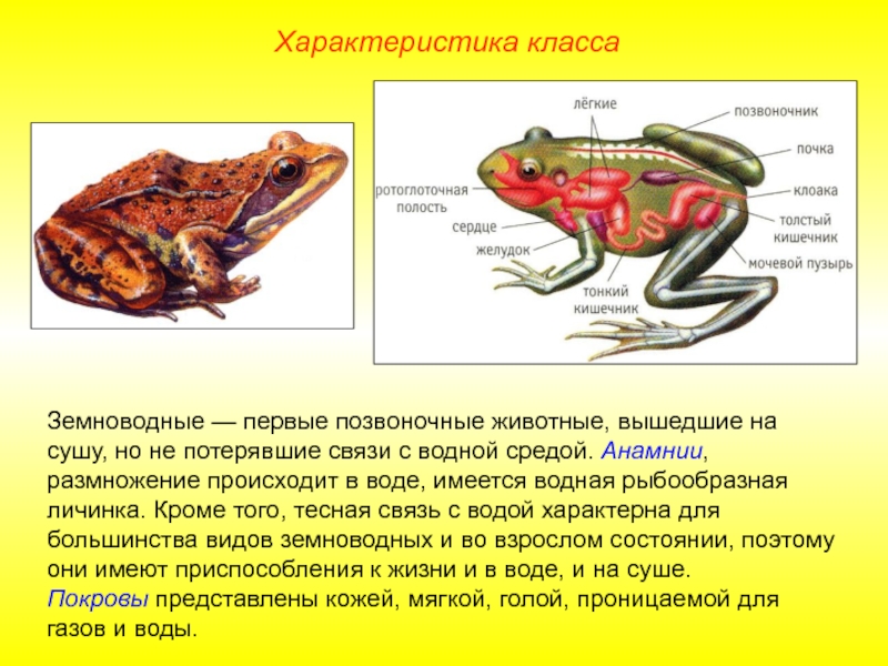 потерявшие связи с водной средой. Анамнии, размножение происходит в воде, имеется водная рыбообразная личинка. Кроме того, тесная связь с водой характерна для большинства видов земноводных и во взрослом состоянии, поэтому они имеют приспособления к жизни и в воде, и на суше.