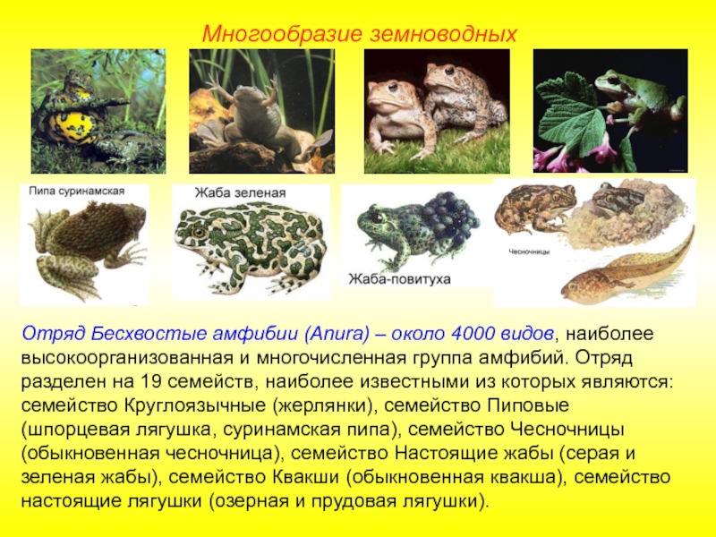 Отряд Бесхвостые амфибии (Anura) – около 4000 видов, наиболее высокоорганизованная
