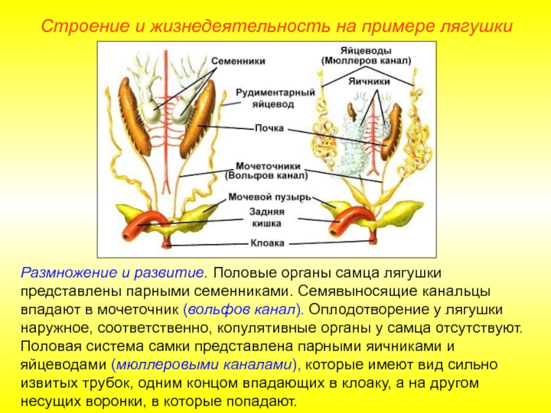 Слайд 33Размножение и развитие. Половые органы самца лягушки представлены парными семенниками. Семявыносящие