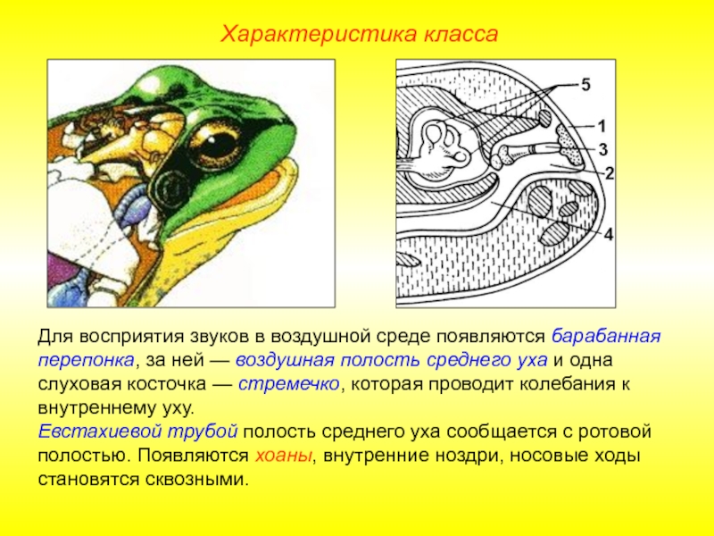 Евстахиевой трубой полость среднего уха сообщается с ротовой полостью. Появляются хоаны, внутренние ноздри, носовые ходы становятся сквозными.