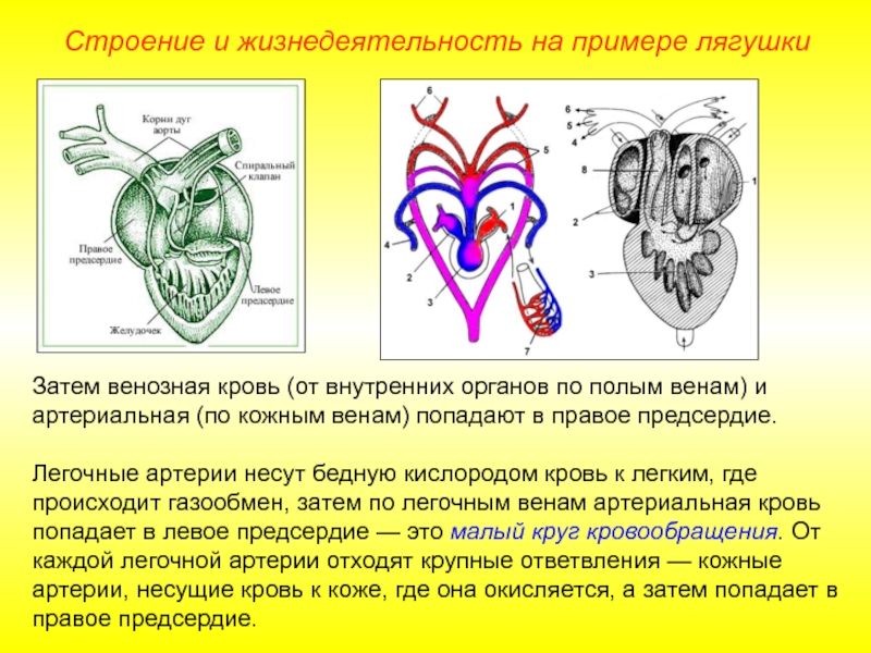 и одним желудочком. В левое предсердие от легких по легочным венам поступает артериальная кровь, а в правое предсердие — смешанная, так как в полые вены от внутренних органов поступает венозная кровь, а кожные вены приносят артериальную кровь.