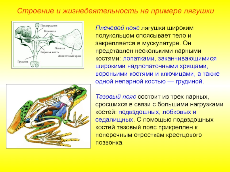 Слайд 17Плечевой пояс лягушки широким полукольцом опоясывает тело и закрепляется в мускулатуре.
