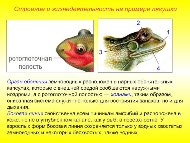Слайд 29Орган обоняния земноводных расположен в парных обонятельных капсулах, которые с внешней