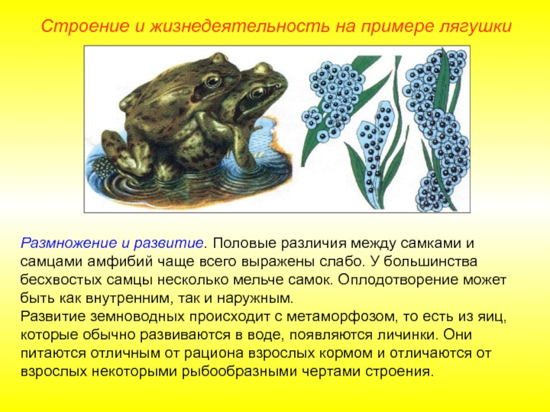 Слайд 34Размножение и развитие. Половые различия между самками и самцами амфибий чаще