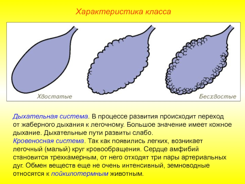 Кровеносная система. Так как появились легких, возникает легочный (малый) круг кровообращения. Сердце амфибий становится трехкамерным, от него отходят три пары артериальных дуг. Обмен веществ еще не очень интенсивный, земноводные относятся к пойкилотермным животным.