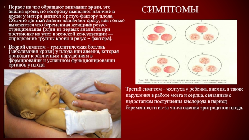 Третий симптом – желтуха у ребенка, анемия, а также нарушения в работе мозга и сердца, связанные с недостатком поступления кислорода в период беременности из-за уничтожения эритроцитов плода.