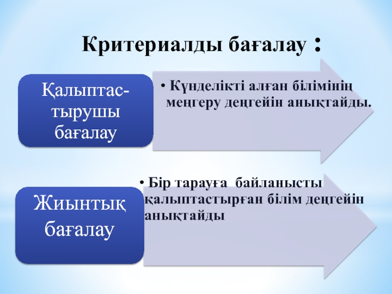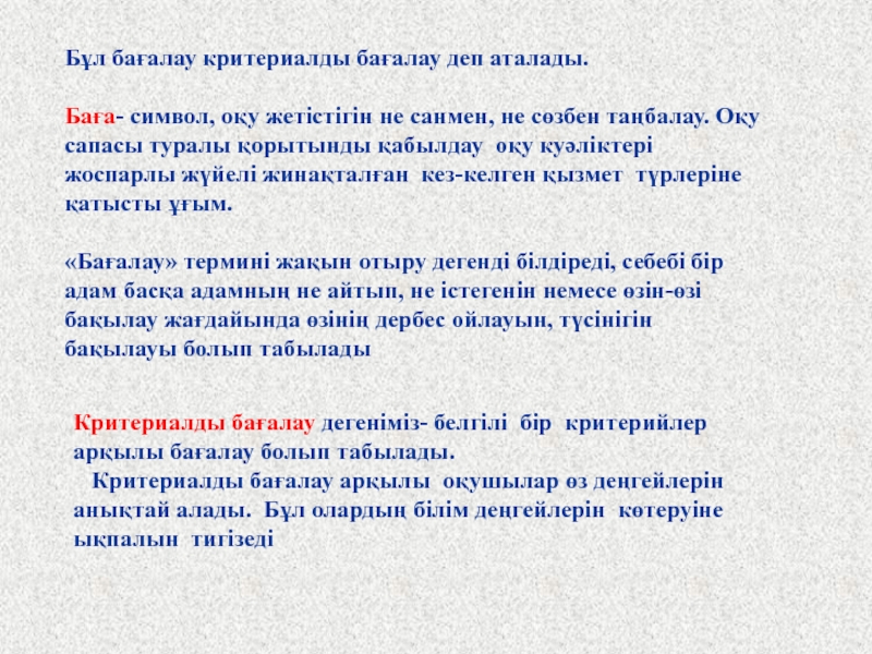 Критериалды бағалау дегеніміз- белгілі бір критерийлер арқылы бағалау болып табылады.