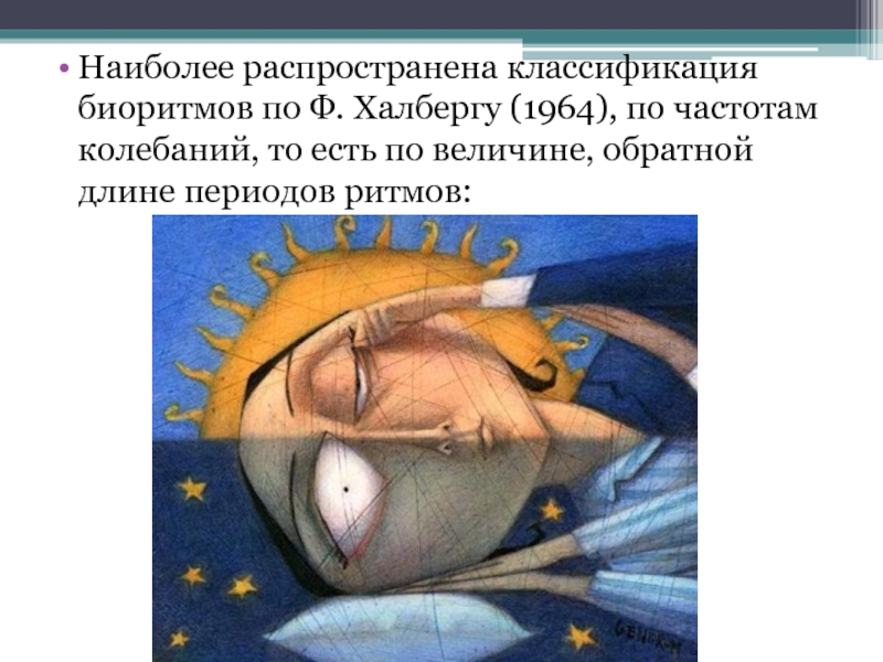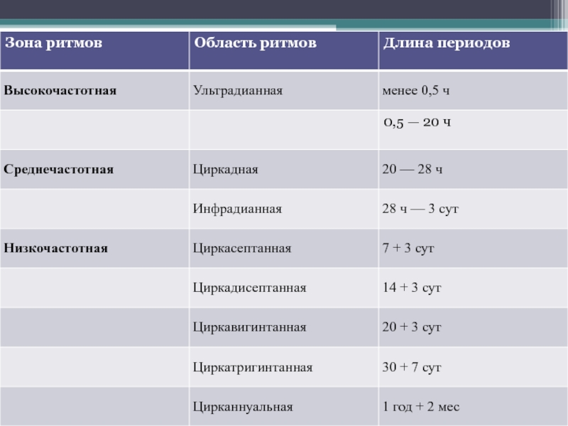 Слайд 5Наиболее распространена классификация биоритмов по Ф. Халбергу (1964), по частотам колебаний, то есть