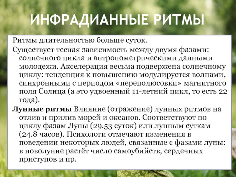 Лунные ритмы Влияние (отражение) лунных ритмов на отлив и прилив морей и океанов. Соответствуют по циклу фазам Луны (29.53 суток) или лунным суткам (24.8 часов). Психологи отмечают изменения в поведении некоторых людей, связанные с фазами луны: в новолуние растёт число самоубийств, сердечных приступов и пр.