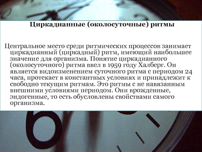 имеющий наибольшее значение для организма. Понятие циркадианного (околосуточного) ритма ввел в 1959 году Халберг. Он является видоизменением суточного ритма с периодом 24 часа, протекает в константных условиях и принадлежит к свободно текущим ритмам. Это ритмы с не навязанным внешними условиями периодом. Они врожденные, эндогенные, то есть обусловлены свойствами самого организма.