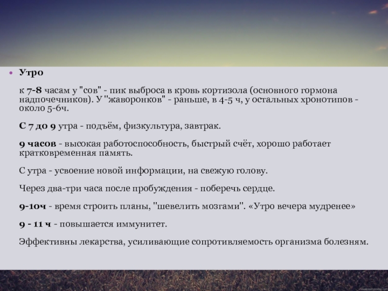 (основного гормона надпочечников). У "жаворонков" - раньше, в 4-5 ч, у остальных хронотипов - около 5-6ч.