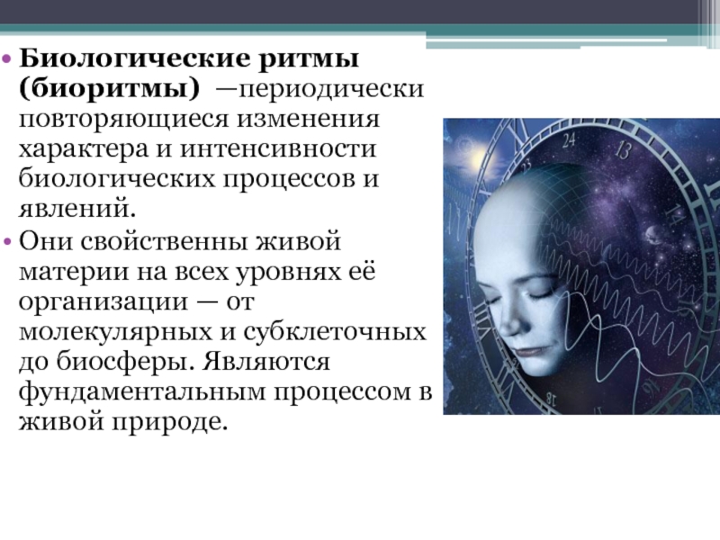 Слайд 2Биологические ритмы (биоритмы) —периодически повторяющиеся изменения характера и интенсивности биологических процессов