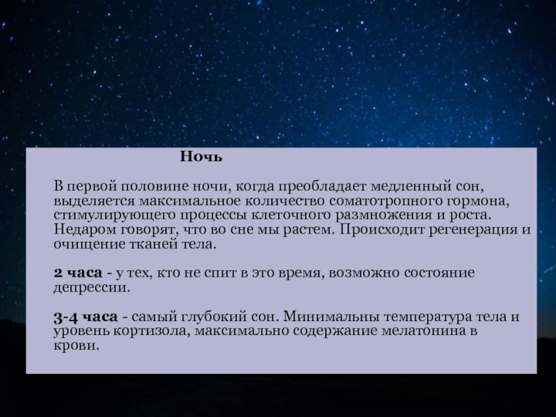 В первой половине ночи, когда преобладает медленный сон, выделяется максимальное количество соматотропного гормона, стимулирующего процессы клеточного размножения и роста. Недаром говорят, что во сне мы растем. Происходит регенерация и очищение тканей тела.