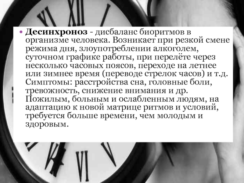 Слайд 16Десинхроноз - дисбаланс биоритмов в организме человека. Возникает при резкой смене режима