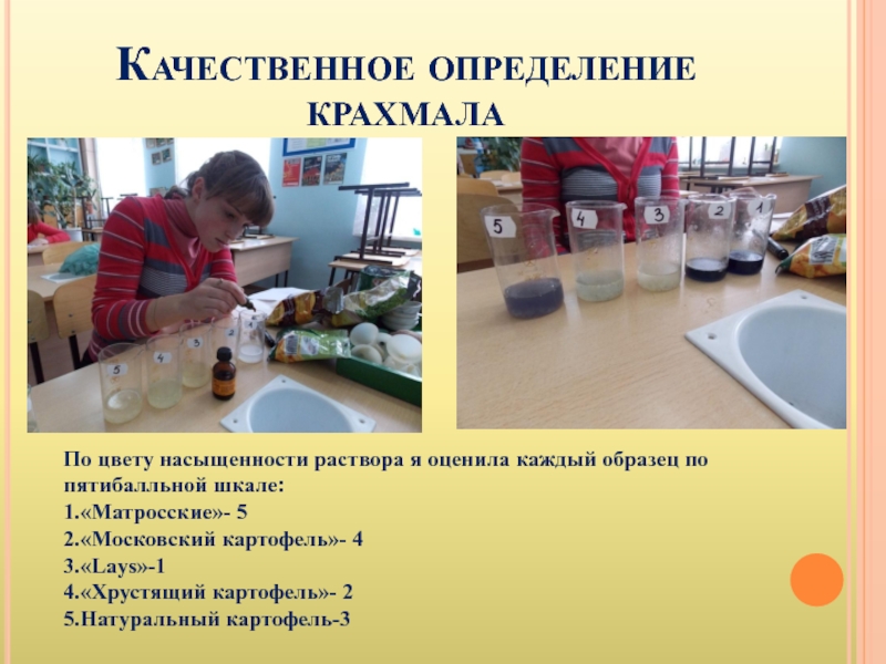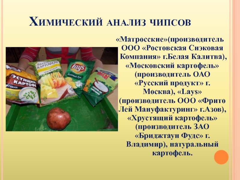 картофель»(производитель ОАО «Русский продукт» г. Москва), «Lays»(производитель ООО «Фрито Лей Мануфактуринг» г.Азов), «Хрустящий картофель» (производитель ЗАО «Бриджтаун Фудс» г.Владимир), натуральный картофель.