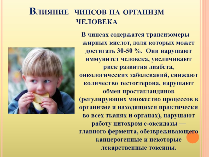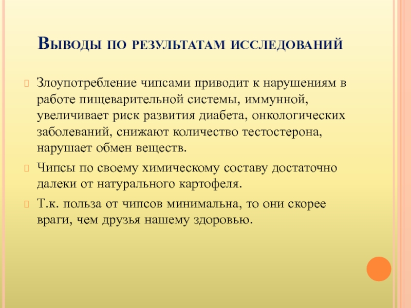 основании исследований сделать вывод о влиянии чипсов на здоровье человека, ответить на вопрос: Враги или друзья чипсы.
