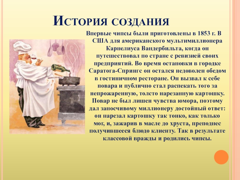 американского мультимиллионера Карнелиуса Вандербильта, когда он путешествовал по стране с ревизией своих предприятий. Во время остановки в городке Саратога-Спрингс он остался недоволен обедом в гостиничном ресторане. Он вызвал к себе повара и публично стал распекать того за непрожаренную, толсто нарезанную картошку. Повар не был лишен чувства юмора, поэтому дал заносчивому миллионеру достойный ответ: он нарезал картошку так тонко, как только мог, и, зажарив в масле до хруста, преподнес получившееся блюдо клиенту. Так в результате классовой вражды и родились чипсы.