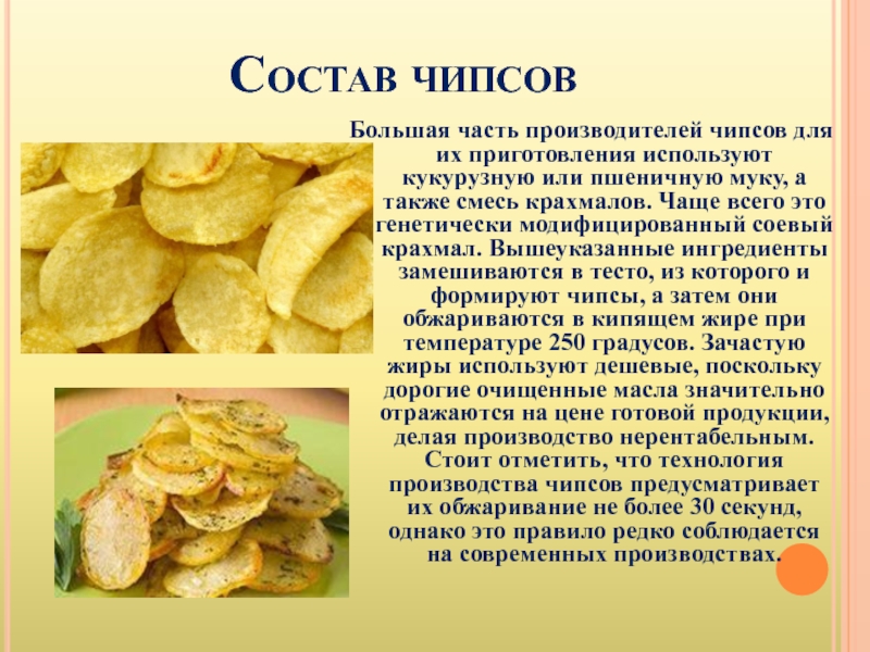 пшеничную муку, а также смесь крахмалов. Чаще всего это генетически модифицированный соевый крахмал. Вышеуказанные ингредиенты замешиваются в тесто, из которого и формируют чипсы, а затем они обжариваются в кипящем жире при температуре 250 градусов. Зачастую жиры используют дешевые, поскольку дорогие очищенные масла значительно отражаются на цене готовой продукции, делая производство нерентабельным. Стоит отметить, что технология производства чипсов предусматривает их обжаривание не более 30 секунд, однако это правило редко соблюдается на современных производствах.