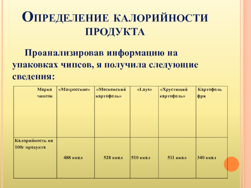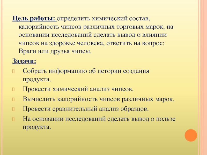Слайд 2Цель работы: определить химический состав, калорийность чипсов различных торговых марок, на