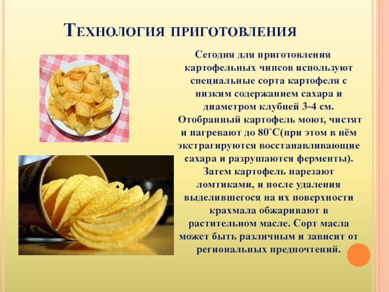низким содержанием сахара и диаметром клубней 3-4 см. Отобранный картофель моют, чистят и нагревают до 80˚С(при этом в нём экстрагируются восстанавливающие сахара и разрушаются ферменты). Затем картофель нарезают ломтиками, и после удаления выделившегося на их поверхности крахмала обжаривают в растительном масле. Сорт масла может быть различным и зависит от региональных предпочтений.