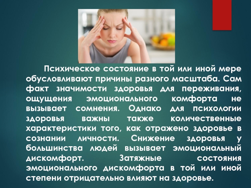 мере обусловливают причины разного масштаба. Сам факт значимости здоровья для переживания, ощущения эмоционального комфорта не вызывает сомнения. Однако для психологии здоровья важны также количественные характеристики того, как отражено здоровье в сознании личности. Снижение здоровья у большинства людей вызывает эмоциональный дискомфорт. Затяжные состояния эмоционального дискомфорта в той или иной степени отрицательно влияют на здоровье.