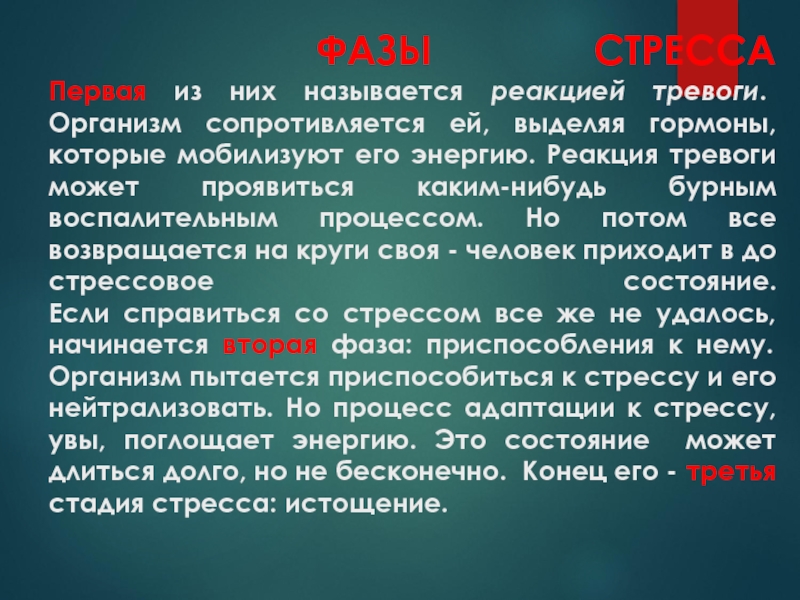 выделяя гормоны, которые мобилизуют его энергию. Реакция тревоги может проявиться каким-нибудь бурным воспалительным процессом. Но потом все возвращается на круги своя - человек приходит в до стрессовое состояние.