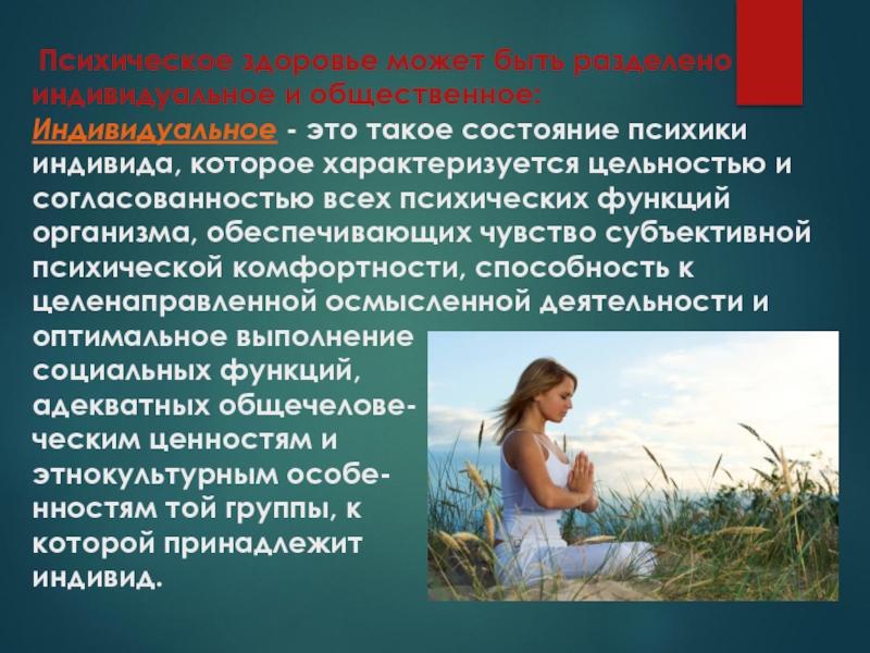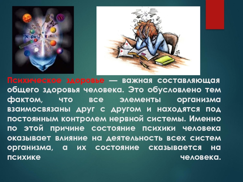 Слайд 4Психическое здоровье — важная составляющая общего здоровья человека. Это обусловлено тем