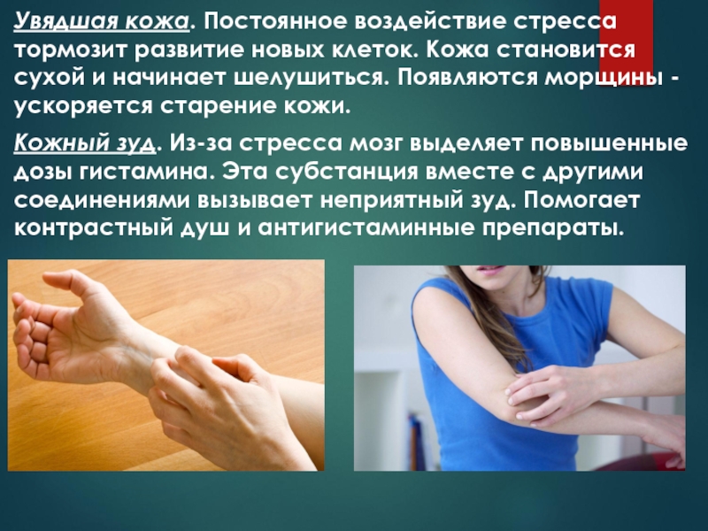 Кожный зуд. Из-за стресса мозг выделяет повышенные дозы гистамина. Эта субстанция вместе с другими соединениями вызывает неприятный зуд. Помогает контрастный душ и антигистаминные препараты.