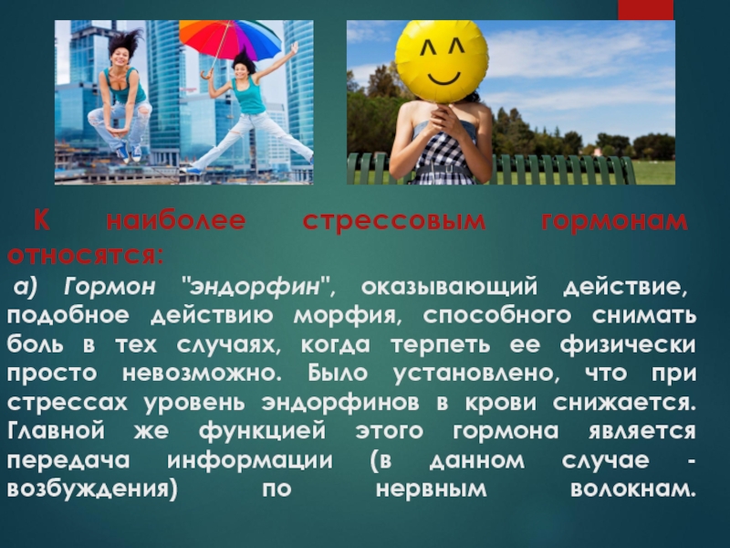 морфия, способного снимать боль в тех случаях, когда терпеть ее физически просто невозможно. Было установлено, что при стрессах уровень эндорфинов в крови снижается. Главной же функцией этого гормона является передача информации (в данном случае - возбуждения) по нервным волокнам.