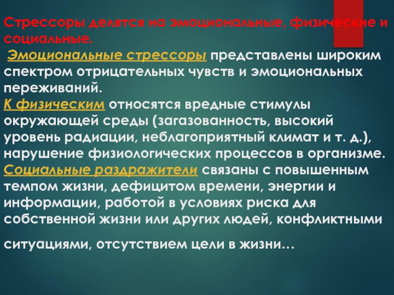 Слайд 15Стрессоры делятся на эмоциональные, физические и социальные.