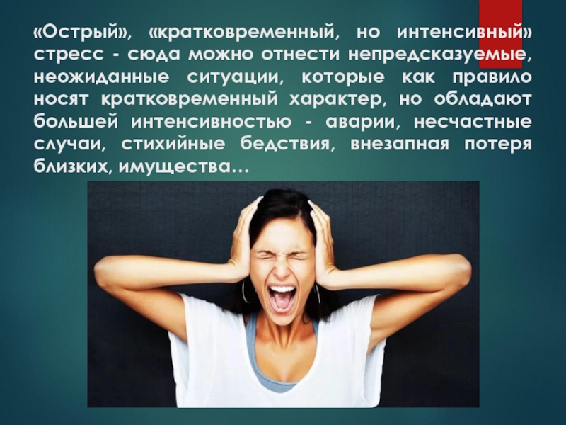 Слайд 20«Острый», «кратковременный, но интенсивный» стресс - сюда можно отнести непредсказуемые, неожиданные