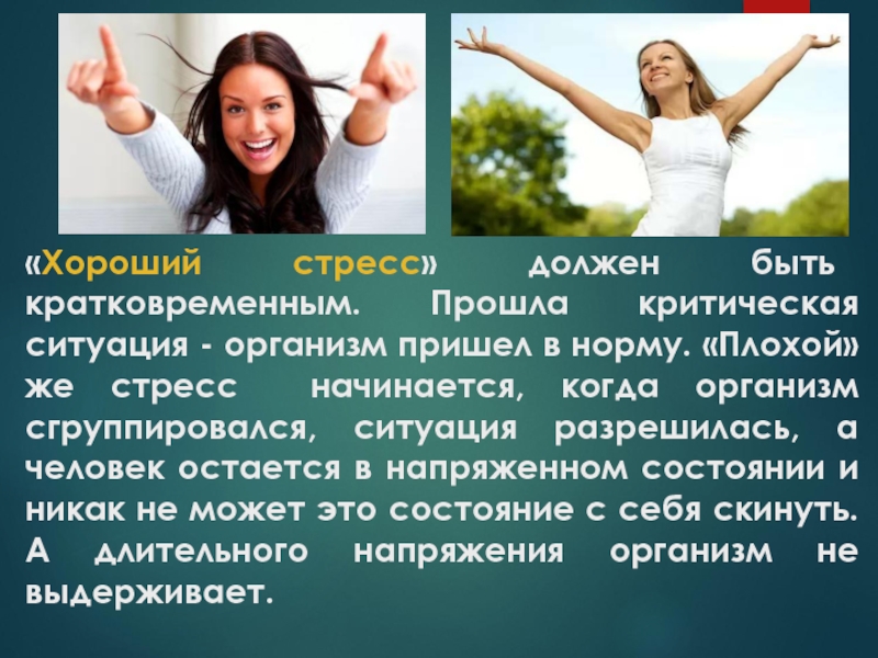 Слайд 18«Хороший стресс» должен быть кратковременным. Прошла критическая ситуация - организм пришел