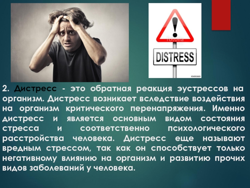 вследствие воздействия на организм критического перенапряжения. Именно дистресс и является основным видом состояния стресса и соответственно психологического расстройства человека. Дистресс еще называют вредным стрессом, так как он способствует только негативному влиянию на организм и развитию прочих видов заболеваний у человека.