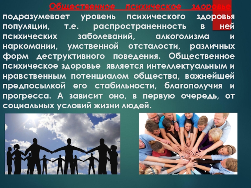 Слайд 7 Общественное психическое здоровье подразумевает уровень психического здоровья популяции,