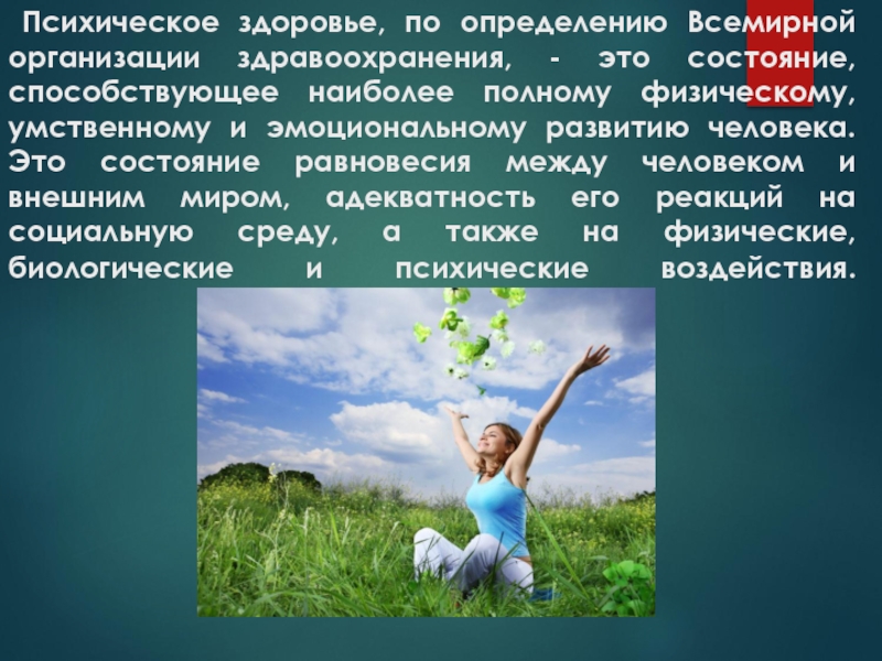 Слайд 5 Психическое здоровье, по определению Всемирной организации здравоохранения, - это состояние,