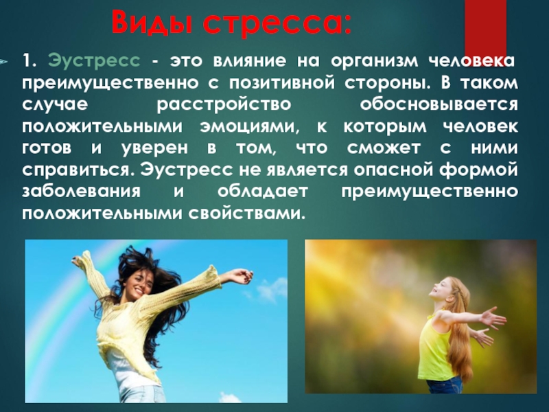 позитивной стороны. В таком случае расстройство обосновывается положительными эмоциями, к которым человек готов и уверен в том, что сможет с ними справиться. Эустресс не является опасной формой заболевания и обладает преимущественно положительными свойствами.