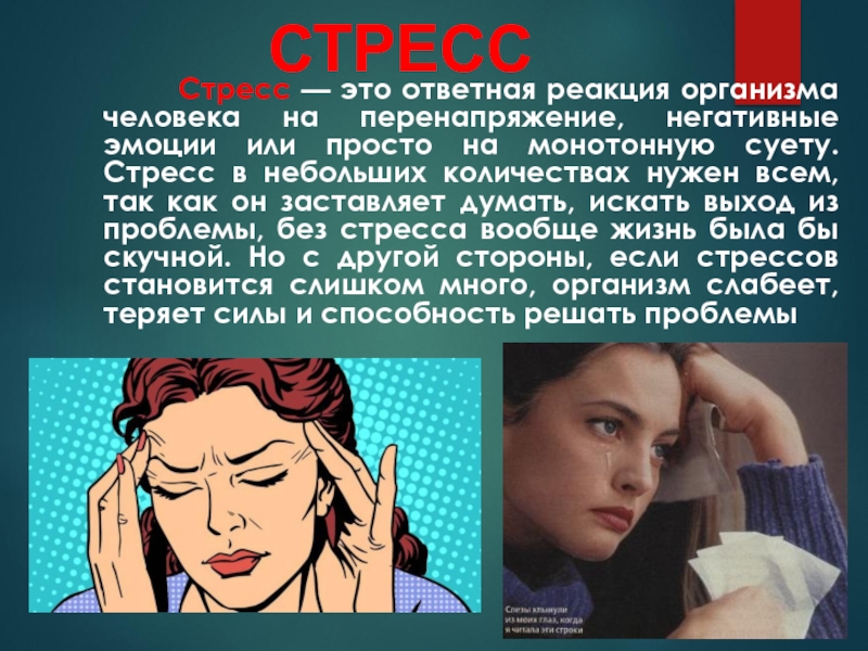 Стресс — это ответная реакция организма человека на перенапряжение, негативные эмоции или просто на монотонную суету. Стресс в небольших количествах нужен всем, так как он заставляет думать, искать выход из проблемы, без стресса вообще жизнь была бы скучной. Но с другой стороны, если стрессов становится слишком много, организм слабеет, теряет силы и способность решать проблемы