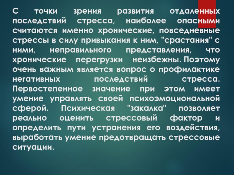хронические, повседневные стрессы в силу привыкания к ним, "срастания" с ними, неправильного представления, что хронические перегрузки неизбежны. Поэтому очень важным является вопрос о профилактике негативных последствий стресса. Первостепенное значение при этом имеет умение управлять своей психоэмоциональной сферой. Психическая "закалка" позволяет реально оценить стрессовый фактор и определить пути устранения его воздействия, выработать умение предотвращать стрессовые ситуации.