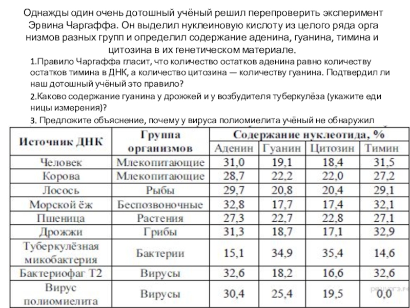 1.Правило Чаргаффа гласит, что количество остатков аденина равно количеству остатков тимина в ДНК, а количество цитозина — количеству гуанина. Подтвердил ли наш дотошный учёный это правило?