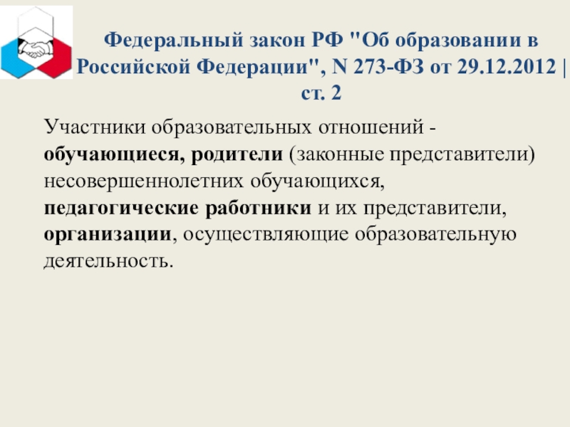 Участники образовательных отношений - обучающиеся, родители (законные представители) несовершеннолетних обучающихся, педагогические работники и их представители, организации, осуществляющие образовательную деятельность.