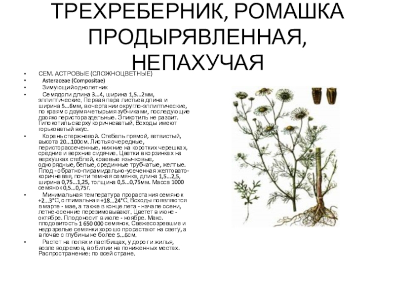 Слайд 16ТРЕХРЕБЕРНИК, РОМАШКА ПРОДЫРЯВЛЕННАЯ, НЕПАХУЧАЯ