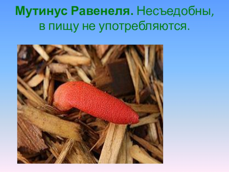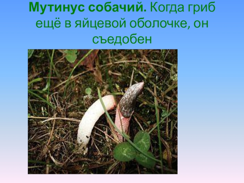 Слайд 15Мутинус собачий. Когда гриб ещё в яйцевой оболочке, он съедобен