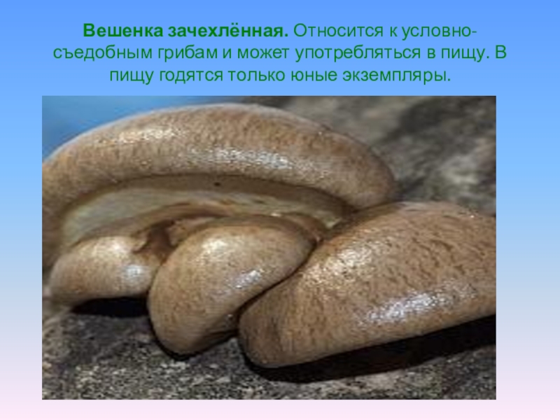 Слайд 17Вешенка зачехлённая. Относится к условно-съедобным грибам и может употребляться в пищу.