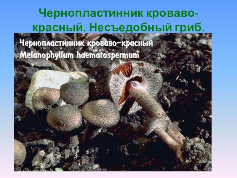Слайд 4Чернопластинник кроваво-красный. Несъедобный гриб.