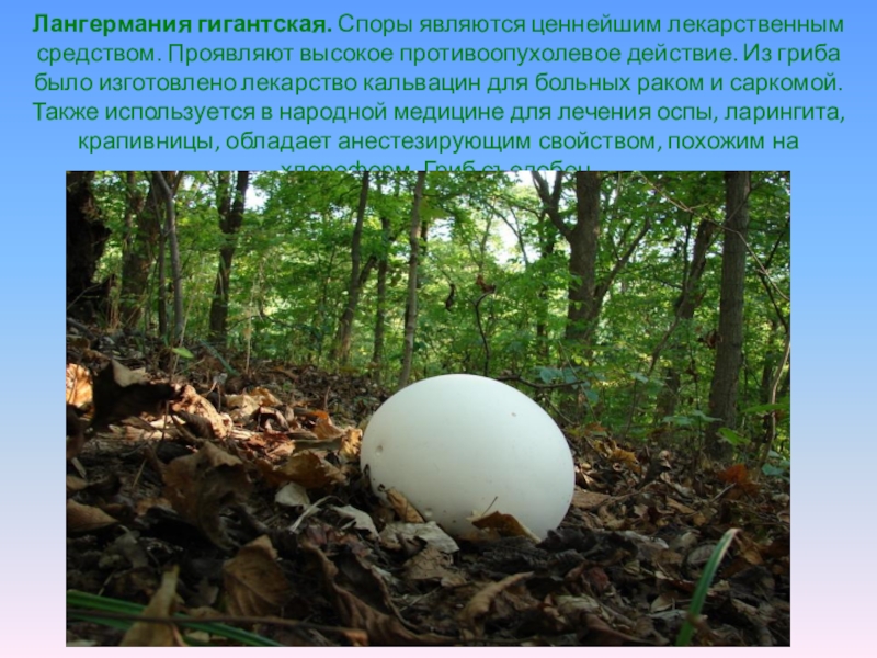 Лангермания гигантская. Споры являются ценнейшим лекарственным средством. Проявляют высокое противоопухолевое действие.
