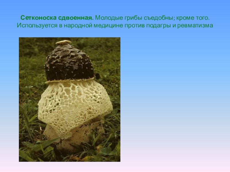 Слайд 14Сетконоска сдвоенная. Молодые грибы съедобны; кроме того. Используется в народной медицине