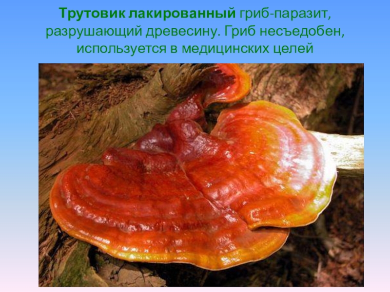 Слайд 7Трутовик лакированный гриб-паразит, разрушающий древесину. Гриб несъедобен, используется в медицинских целей