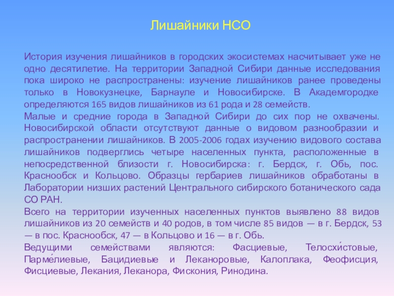 Малые и средние города в Западной Сибири до сих пор не охвачены. Новосибирской области отсутствуют данные о видовом разнообразии и распространении лишайников. В 2005-2006 годах изучению видового состава лишайников подверглись четыре населенных пункта, расположенные в непосредственной близости г. Новосибирска: г. Бердск, г. Обь, пос. Краснообск и Кольцово. Образцы гербариев лишайников обработаны в Лаборатории низших растений Центрального сибирского ботанического сада СО РАН.