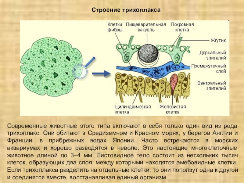 Трихоплаксы живут на мелководьях теплых морей, передвигаясь вдоль дна и время от времени прикрепляясь к различным субстратам. Питается трихоплакс водорослями, цианобактериями и разлагающимися остатками разных морских организмов. Маленькие пищевые частицы трихоплакс поглощает посредством фагоцитоза (их пропускают внутрь тела покровные клетки и заглатывают волокнистые), а крупные облепляет со всех сторон брюшной поверхностью тела, где кроме ресничных клеток имеются железистые, способные выделять пищеварительные ферменты, и так переваривает, после чего покровные клетки поглощают переваренную пищу.