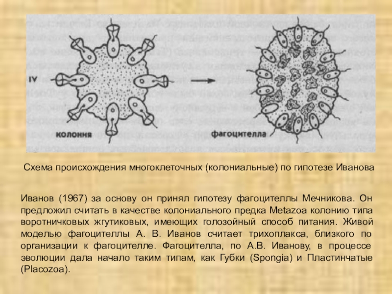 По его мнению, фагоцителла могла возникнуть из шаровидных колоний жгутиконосцев путем иммиграции части клеток внутрь колонии. При этом наружные клетки со жгутиками выполняли функцию движения (кинобласт), восприятия сигналов, защиты, а внутренние — утрачивали жгутики, становились амебоидными и выполняли функции фагоцитоза (фагоцитобласт), размножения. Гаструляция у низших многоклеточных осуществляется именно путем иммиграции.